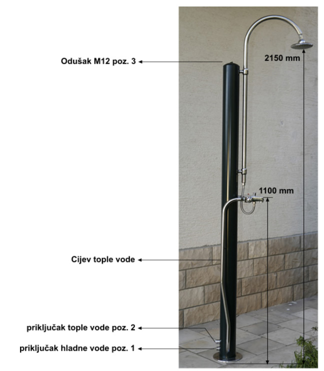 - Solarni tuš pozicionirati na mjestu koje je tijekom dana najviše izloženo suncu - Priloženim vijcima M8 pričvrstiti tuš u podlogu ili na postolje - Na donji nipel G ¾” priključiti vrtno crijevo ( poz.1 ) - Na vrhu tuša ( poz.3 )odviti vijak M12 radi odzračivanja, na bateriji prvo otvoriti toplu i hladnu vodu, a potom i dotok vode u tuš i početi punjenje - Kad voda poteče na glavi tuša i odušniku (poz.3) zatvorit hladnu vodu na miješalici. Smanjiti dotok vode u tuš i sačekati da na glavi tuša poteče voda bez mjehurića zraka, potom zatvoriti ventil tople vode i dotok vode u tuš, te zaviti vijak sa brtvom ( poz.3 ) na vrhu tuša. Ponovo otvoriti dotok vode u tuš i - tuš je spreman za korištenje.
